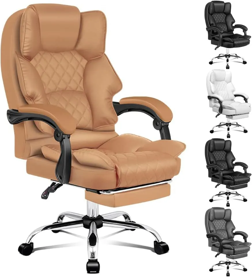 The office chair is built with a chrome base and TUV certified casters. It includes an SGS approved Gas-Lift system and lockable reclination. Padded with resilience foam on the seat, backrest, and armrests, the chair provides support for extended use. Featuring an S-curve backrest design with built-in lumbar support, the chair contours to your body, aiding comfort during extended periods of work or play. It includes a retractable padded footrest and a 360-degree swivel base with height adjustment and recline features. The desk chair has a dual-layer butterfly design that enhances room ambiance.