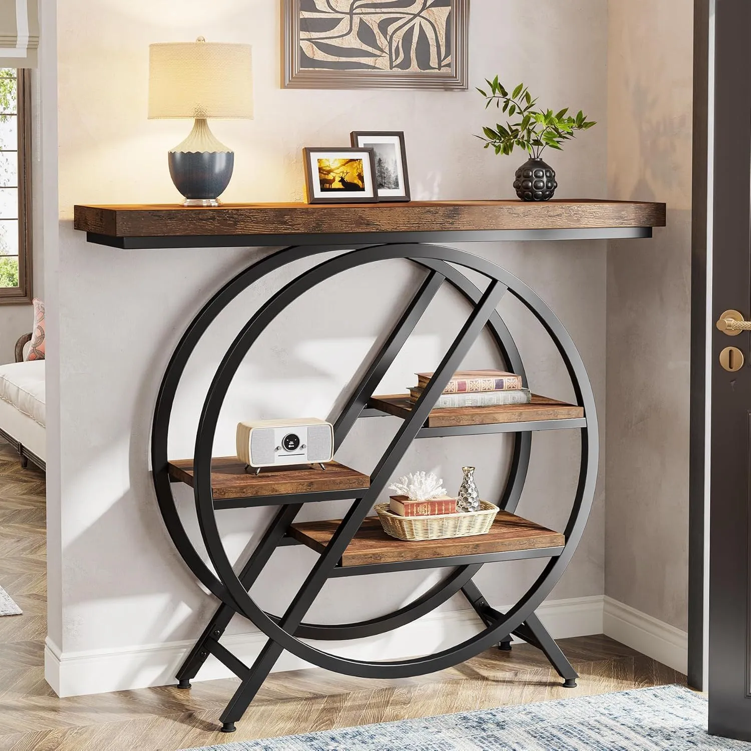 The console table combines rectangular wood boards and a round metal frame for a distinctive appearance. It features an open shelf design for easy access to items.
