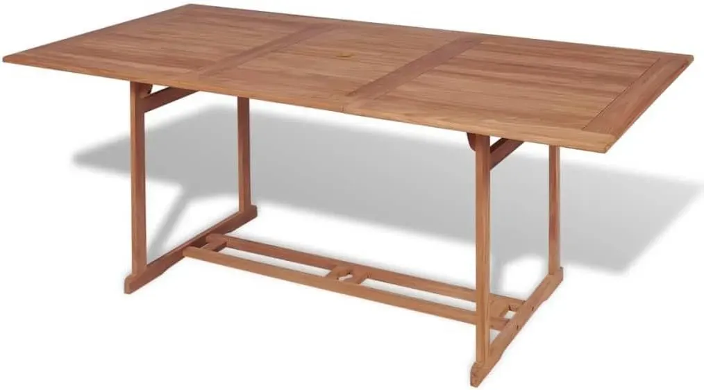 This teak outdoor dining table is designed for outdoor dining in the garden or patio. Made from durable teak hardwood, it has been seasoned, kiln dried, and sanded for a smooth finish. Teak wood is valued for its strength and weather resistance, making it suitable for garden use. The table features a parasol hole for convenience, though the parasol is not included. The surface is easy to clean with a damp cloth.