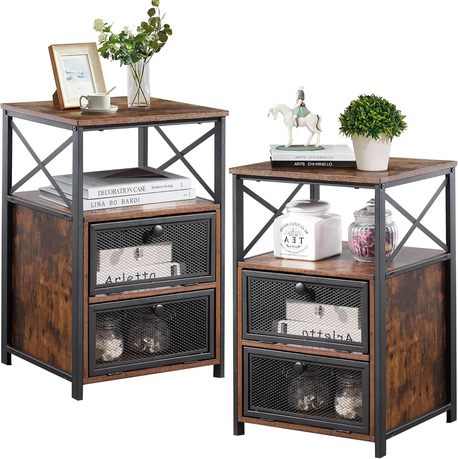 VECELO Scandinavian Style 2-Piece Bedside Table Set with Storage, Brown Wood Grain, 40x35x60cm